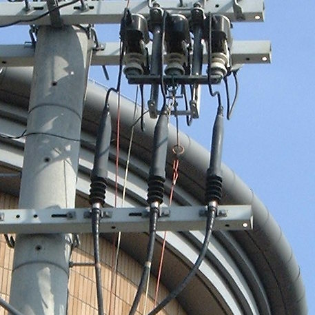 | 架空高圧ケーブル引込線 電力柱より建物等の支持点へ 直接引き込みます。 構内柱が建てられない場合や埋設が難しい場合にオススメです。 |